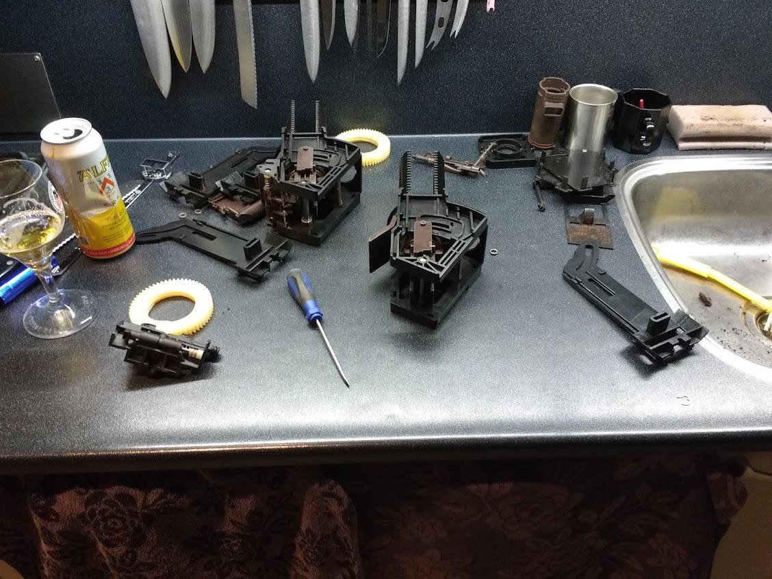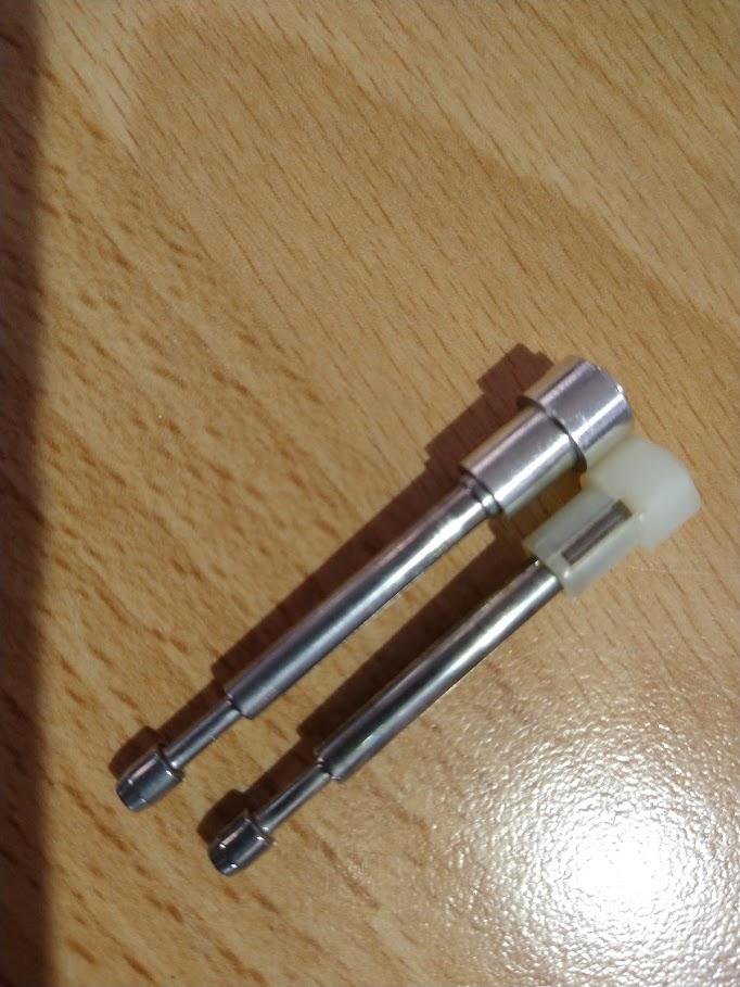 Een jaar later besloot ik ook mijn 2e Jura J5 (welke ik boven gebruik. Ik kan immers niet met een kop koffie de trap op), onder handen te nemen. Alles verliep voorspoedig, ik had al even geoefend. Toch liep ik tegen een probleem aan. Het spoelwater en de koffie kwam niet door de uitloop maar werd direct in de lekbak gegooid. Ruim een jaar later kwam ik achter de oorzaak. Dit probleem ontstond ook bij een ander type apparaat waarbij ik het kunststof dopje van het ventiel had vervangen door de aluminium versie. Wat bleek, er was lengte verschil. Eenvoudig op te lossen door het aluminium dopje iets verder in te boren.